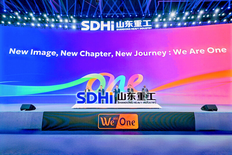 ??大会正式发布山东重工全球品牌标识,任刚、满慎刚、王志坚和战略合作伙伴代表、海外员工代表共同为品牌标识揭幕。