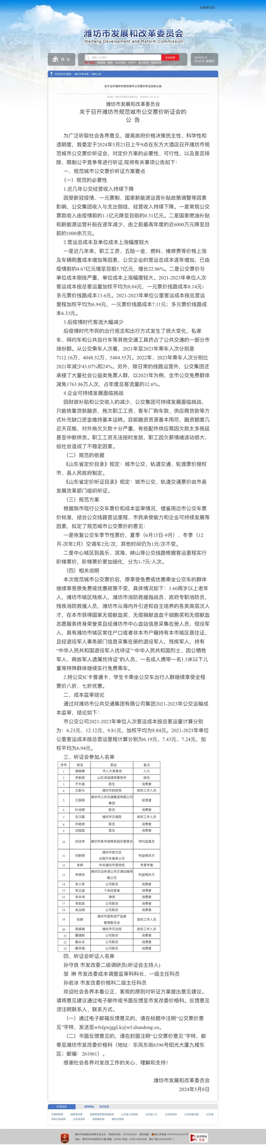 最新公告,潍坊市规范城市公交票价听证会时间确定