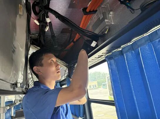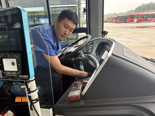 ??发动机舱附近温度较高,站在数米外都能感受到热浪扑面而来。李廷建穿梭其间,检查电路、更换线束、调试配件,一套流程行云流水,即便汗水早已浸透工作服,他依然专注。遇到检修部位深藏难触时,他只能从后机舱的狭小夹缝中钻进去,上半身紧贴着发动机,下半身卡在局促空间里作业?!霸缫环种有藓贸担湍茉缫环种油度朐诵?,这点困难不算啥!”他朴实的话语,道出了所有公交修理工的心声。
