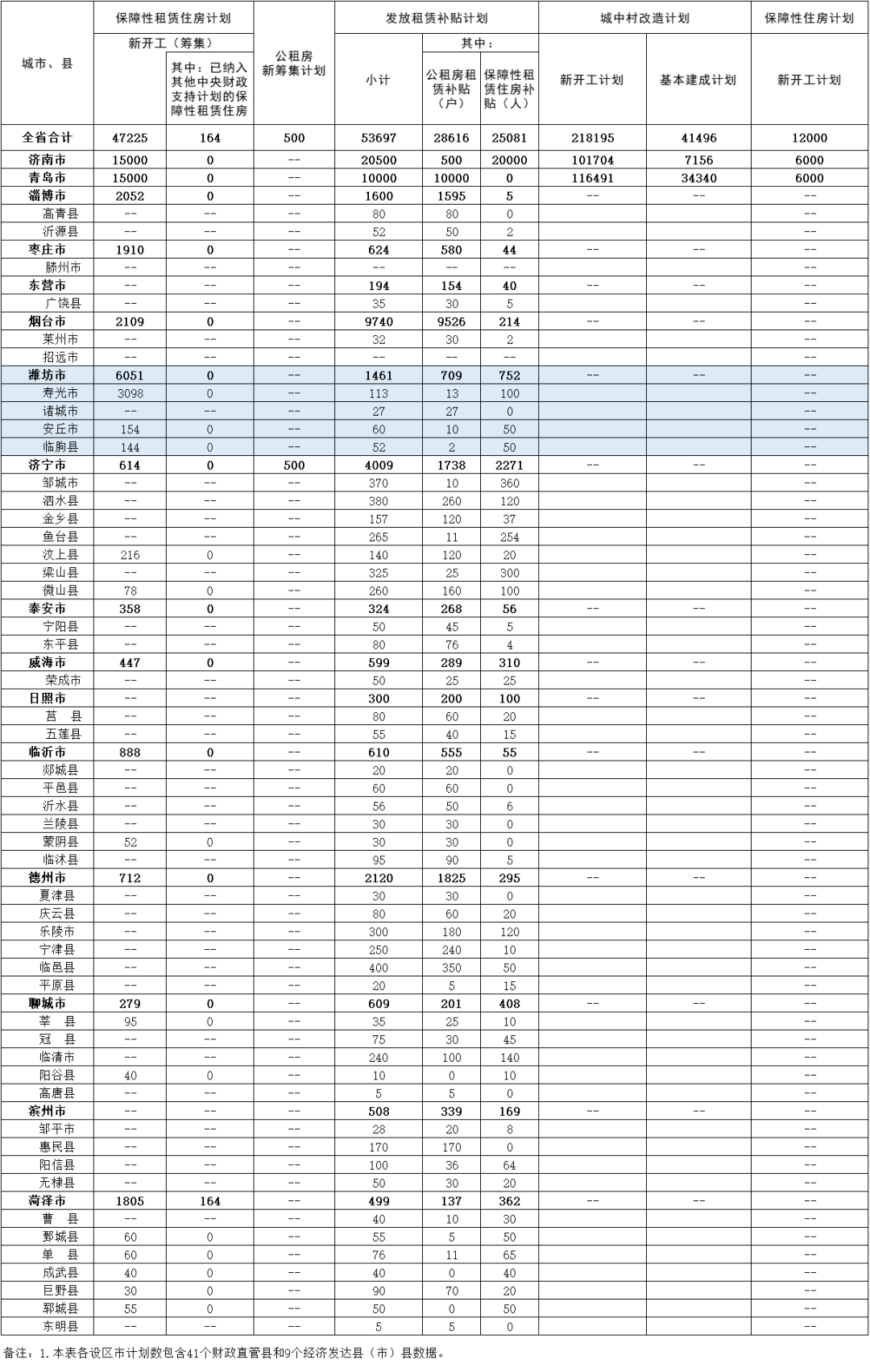 ??2024年山东计划新开工(筹集)保障性租赁住房47225套,公租房筹集500套,发放租赁补贴53697户,城中村安置房新开工218195套,保障性住房新开工12000套。