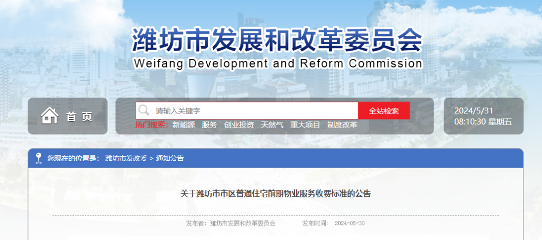 ??5月30日,潍坊市发展和改革委员会网站发布《关于潍坊市普通住宅前期物业服务收费标准的公告》↓↓↓