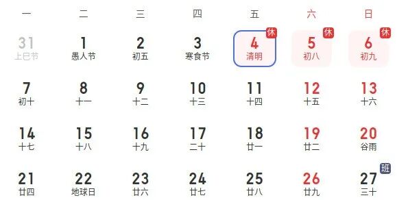 ??清明节放假时间:4月4日(星期五)至4月6日(星期日)